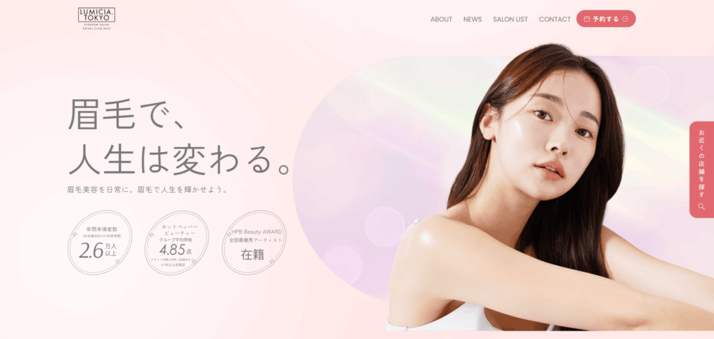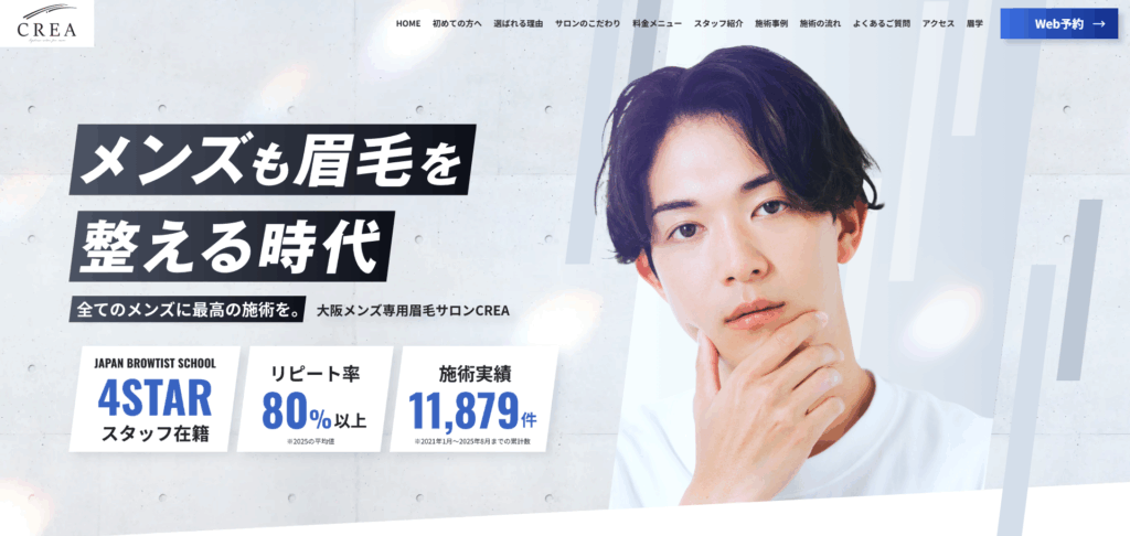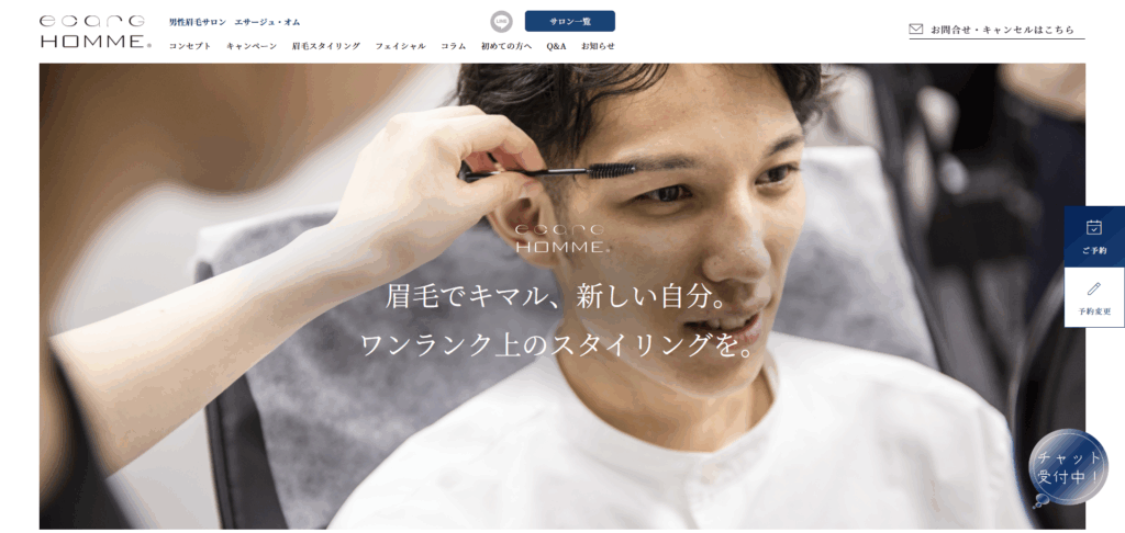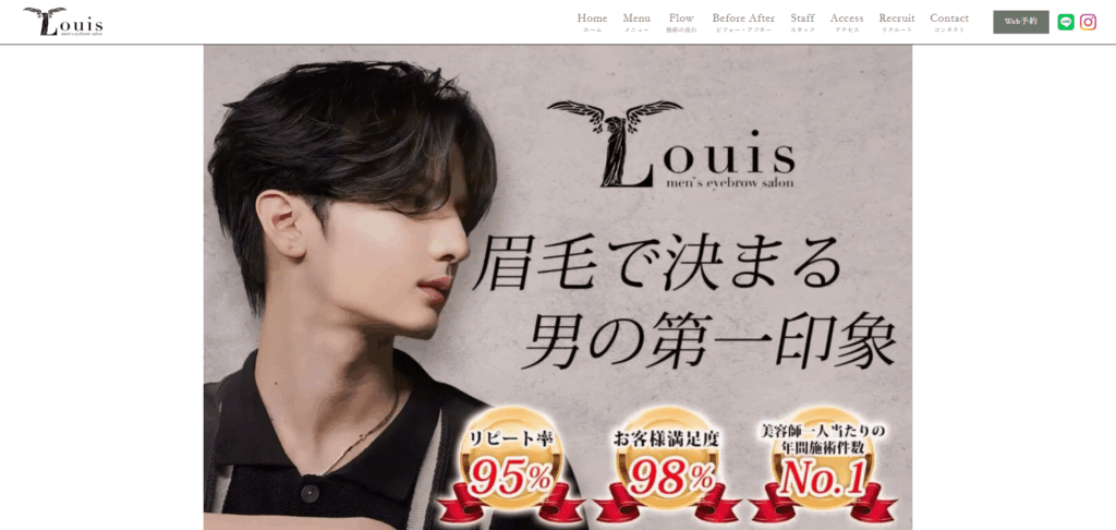 恵比寿発のトレンドサロンとして、「思わずドキッとする色気MAXの眉毛」をコンセプトに掲げるメンズ専門サロンです。月間5000人以上が通うという実績は、このコンセプトが市場に深く浸透している証拠。「顔の印象の80%が眉毛で決まる」というキャッチーでインパクトのあるメッセージは、眉毛ケアの重要性を顧客に強く認識させ、サロンへの来店動機を効果的に創出しています。